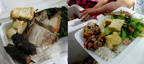 Hộp cơm 25.000 đồng ở căng tin Bệnh viện Nhi Trung ương và cơm 5.000 đồng (phải) của Trung.
